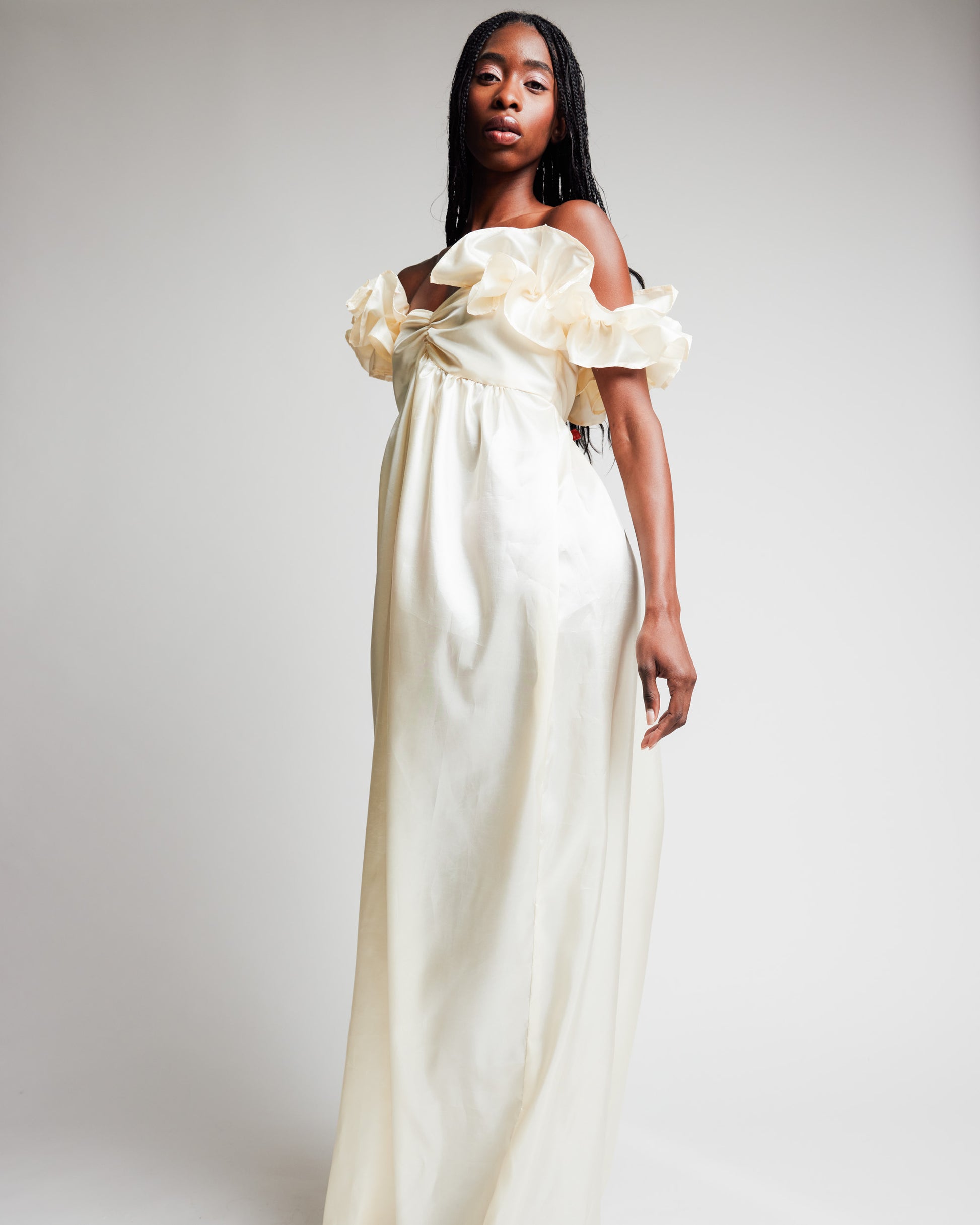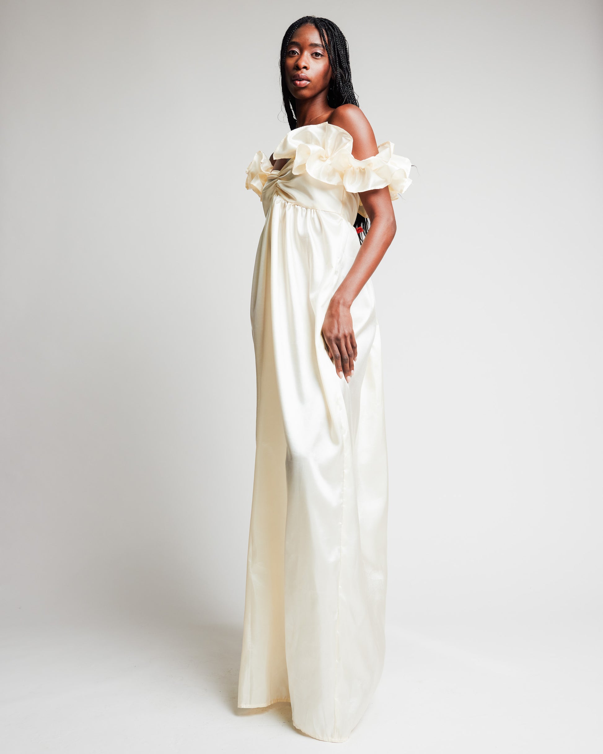 This beautiful creme gown is made of taffeta. The sleeves are ruffled by elastic, you can wear these sleeves on the shoulder or off the shoulder!