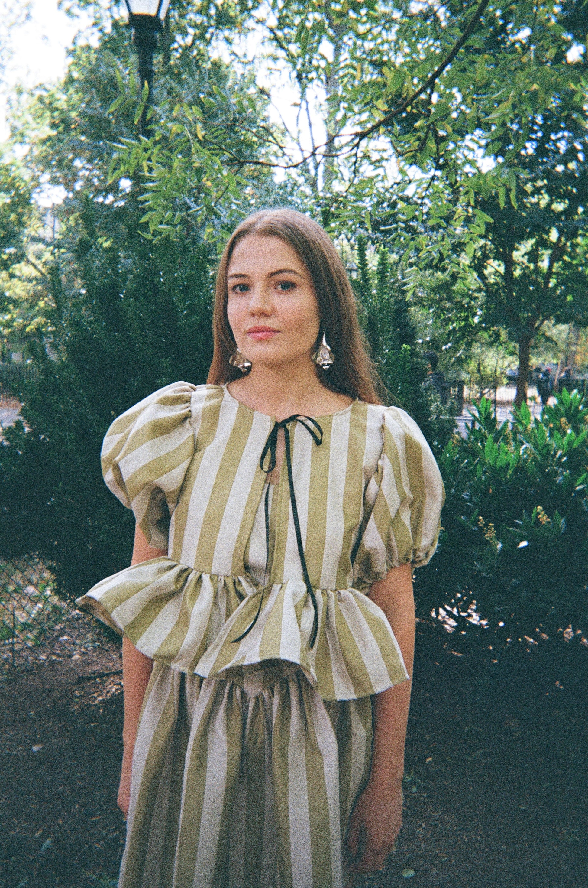 Kels top in green and white stripe upholstery fabric. This blouse can fit size S-L