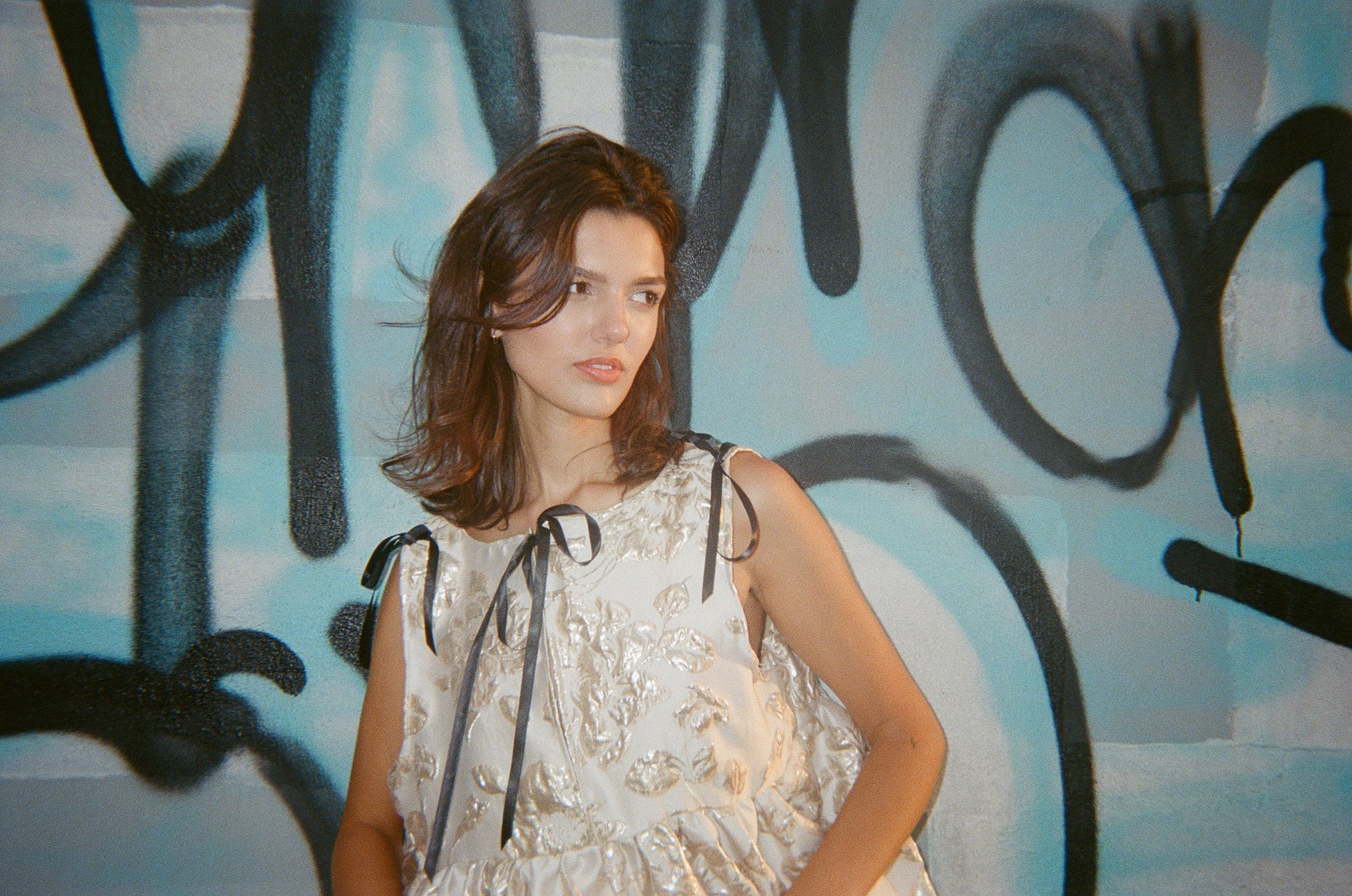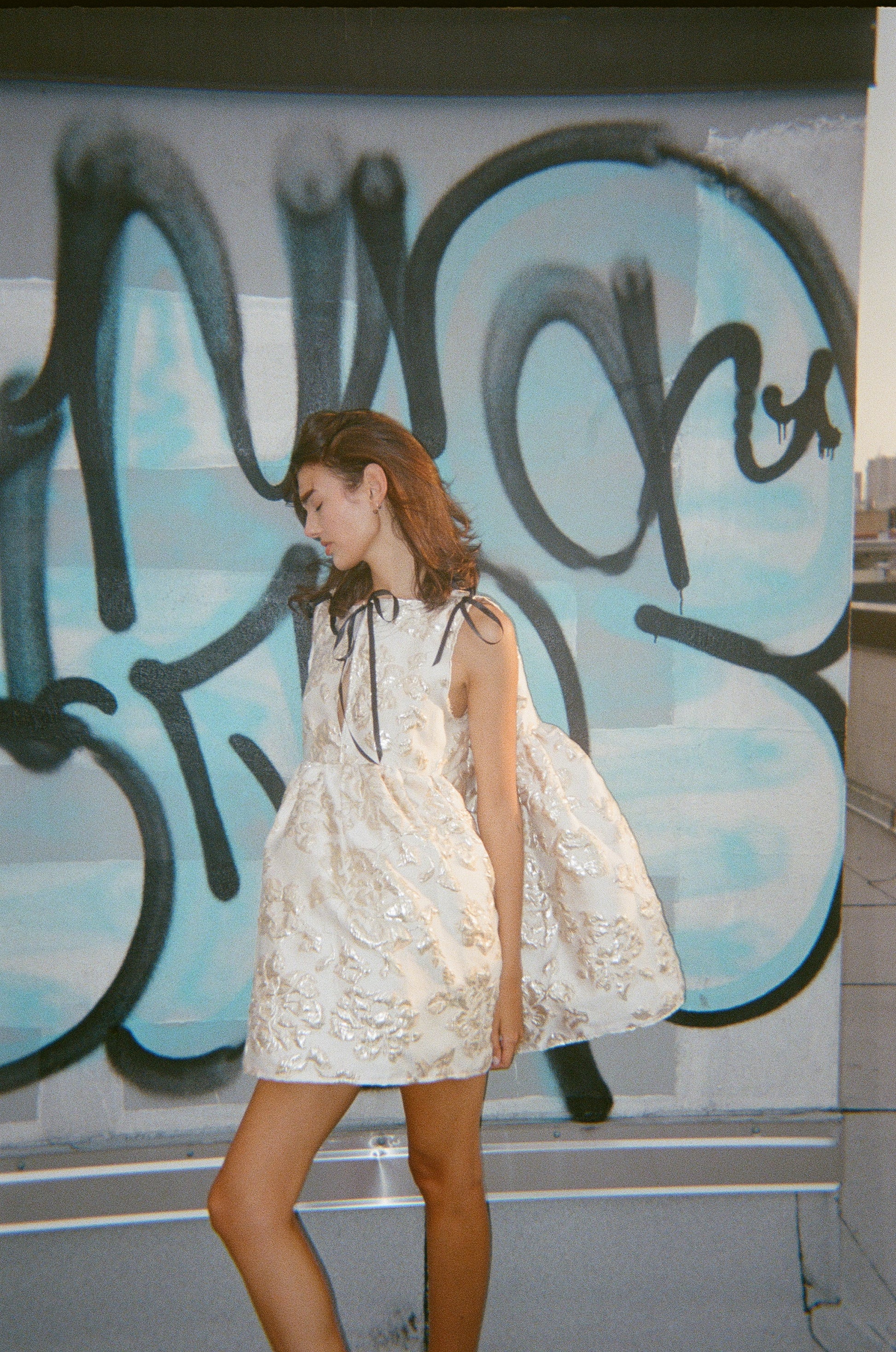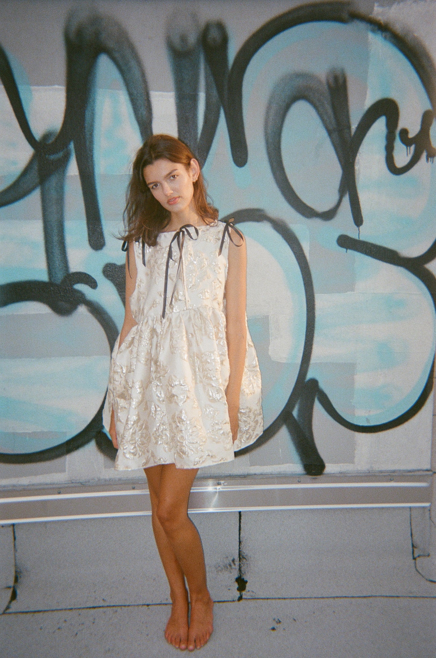This dress is ready for immediate shipment. A beautiful brocade dress adorned in black bows.