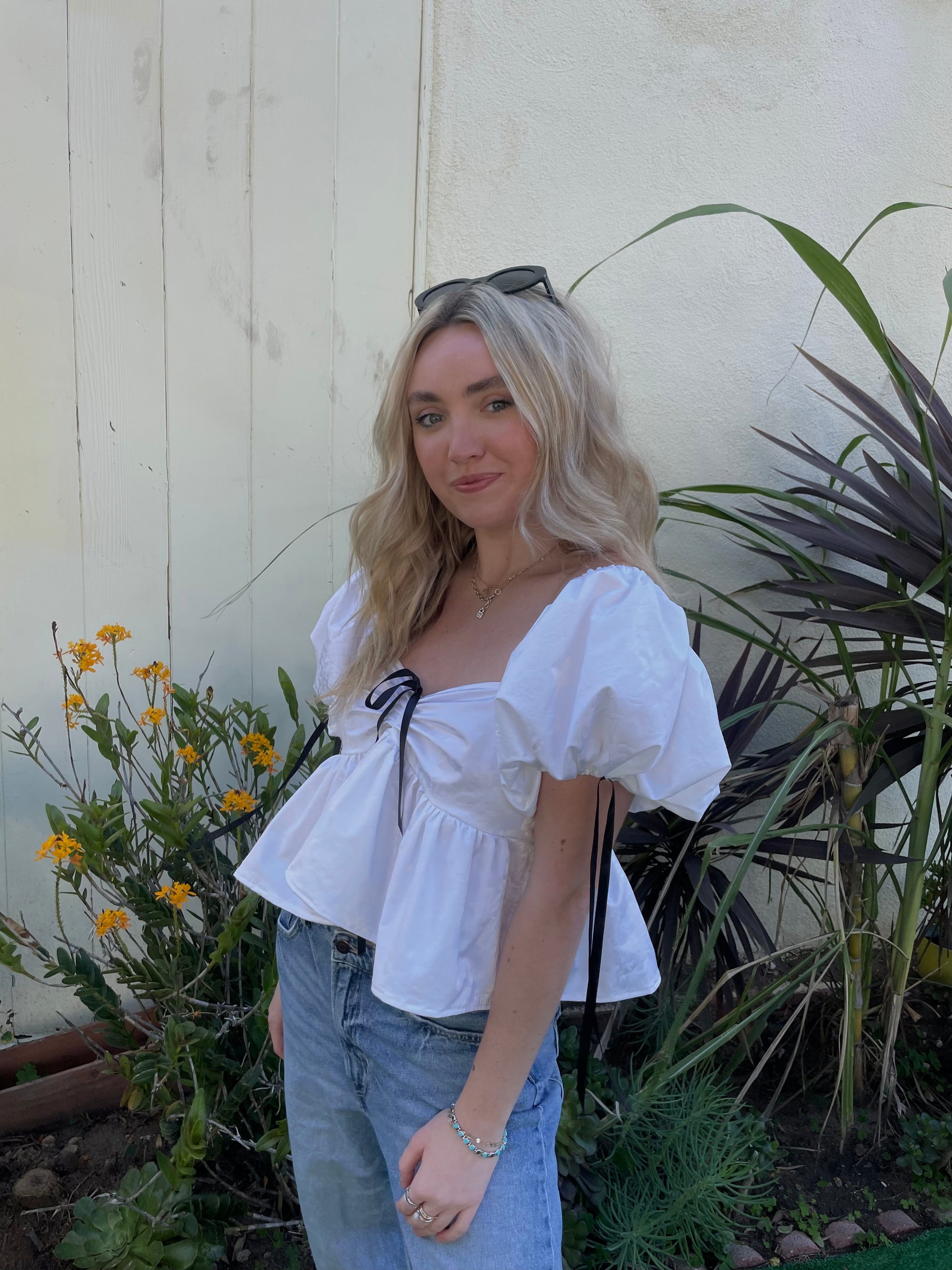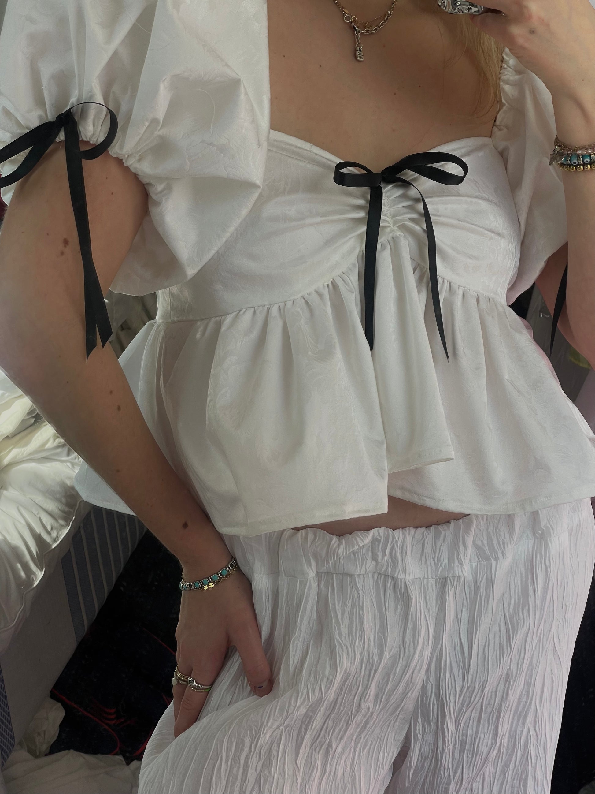 Makenna Blouse with Black Bow Tie in White Tulled Taffeta