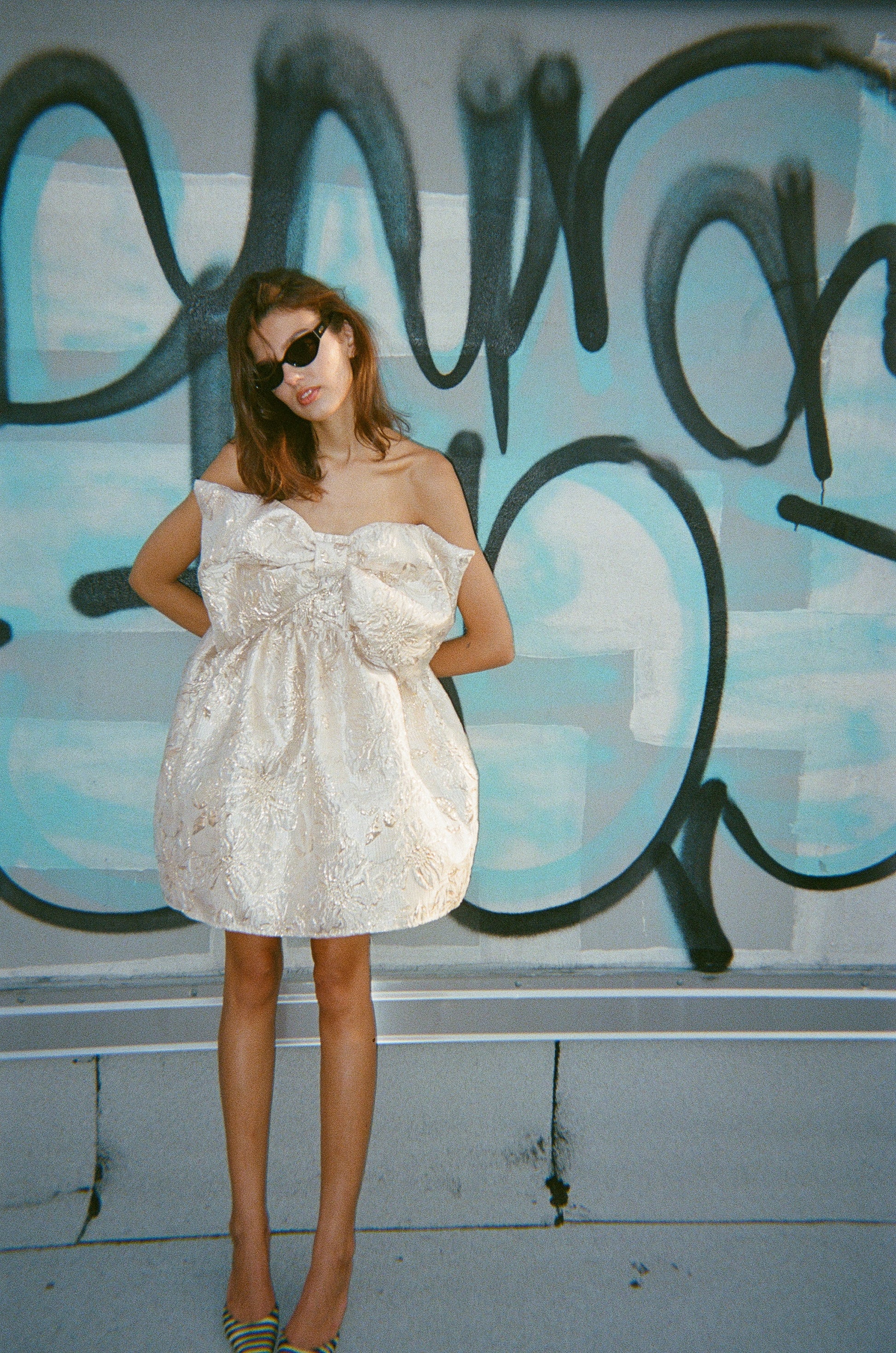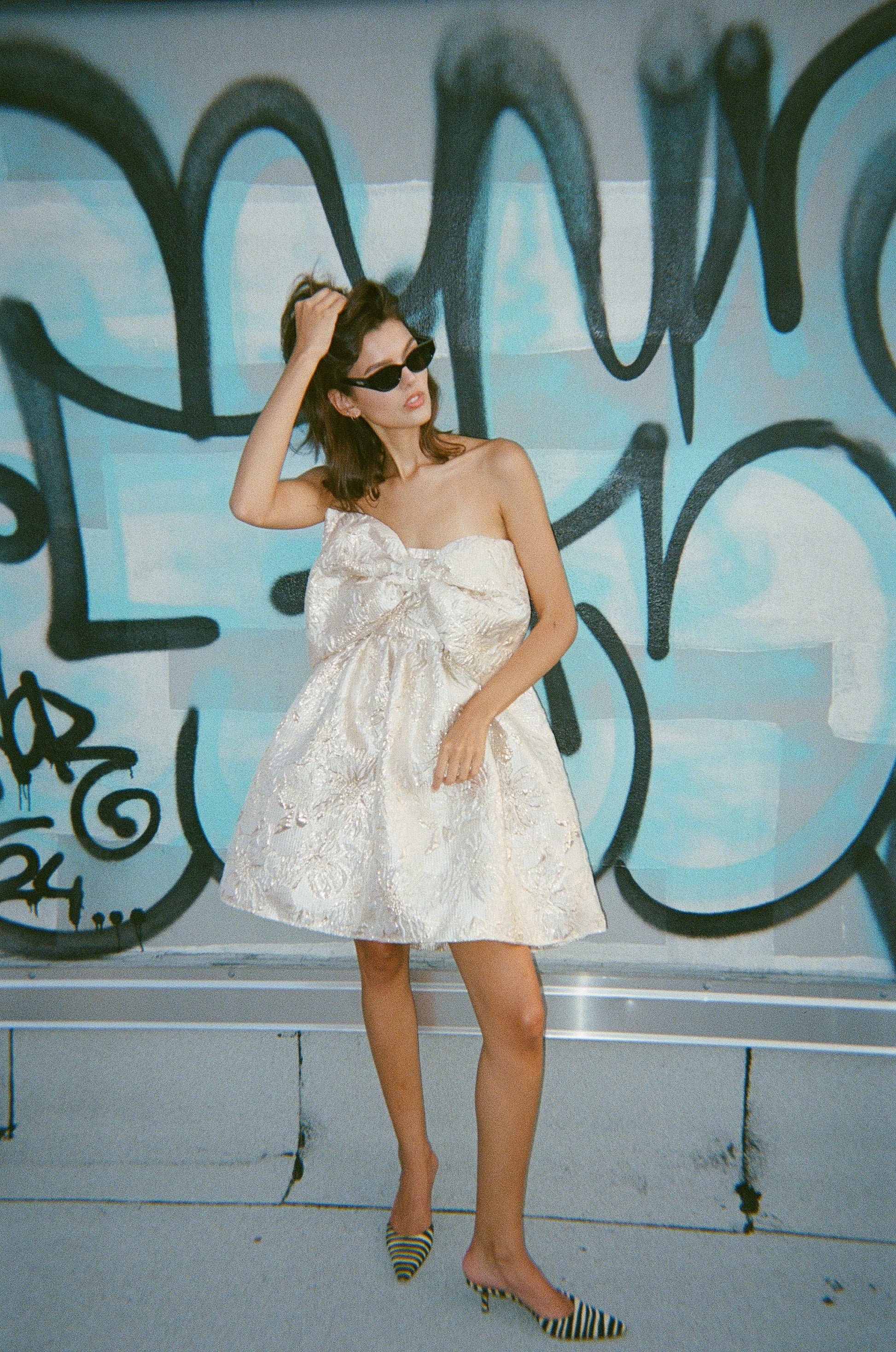 Stewart Mini Bow Dress in Brocade Gold Shimmer