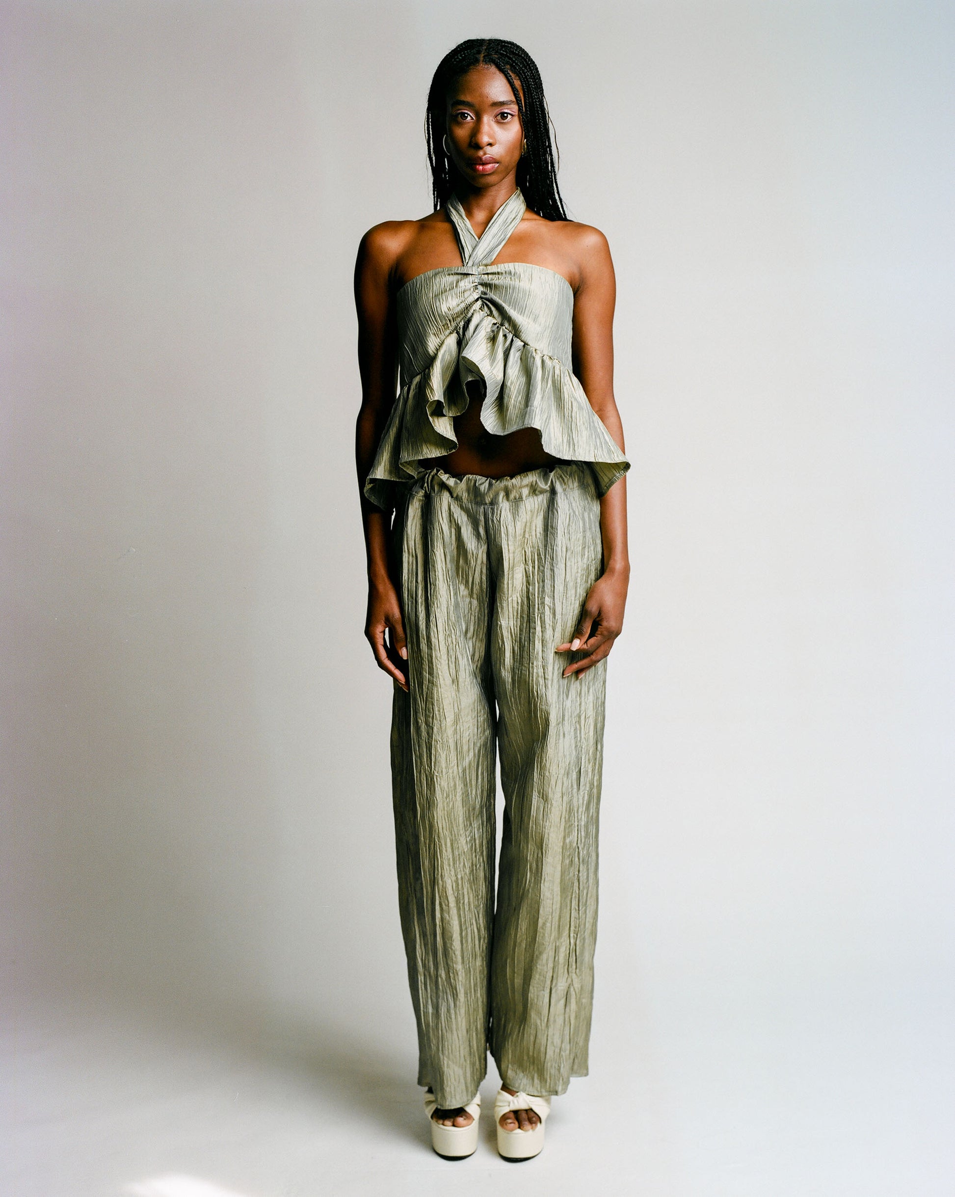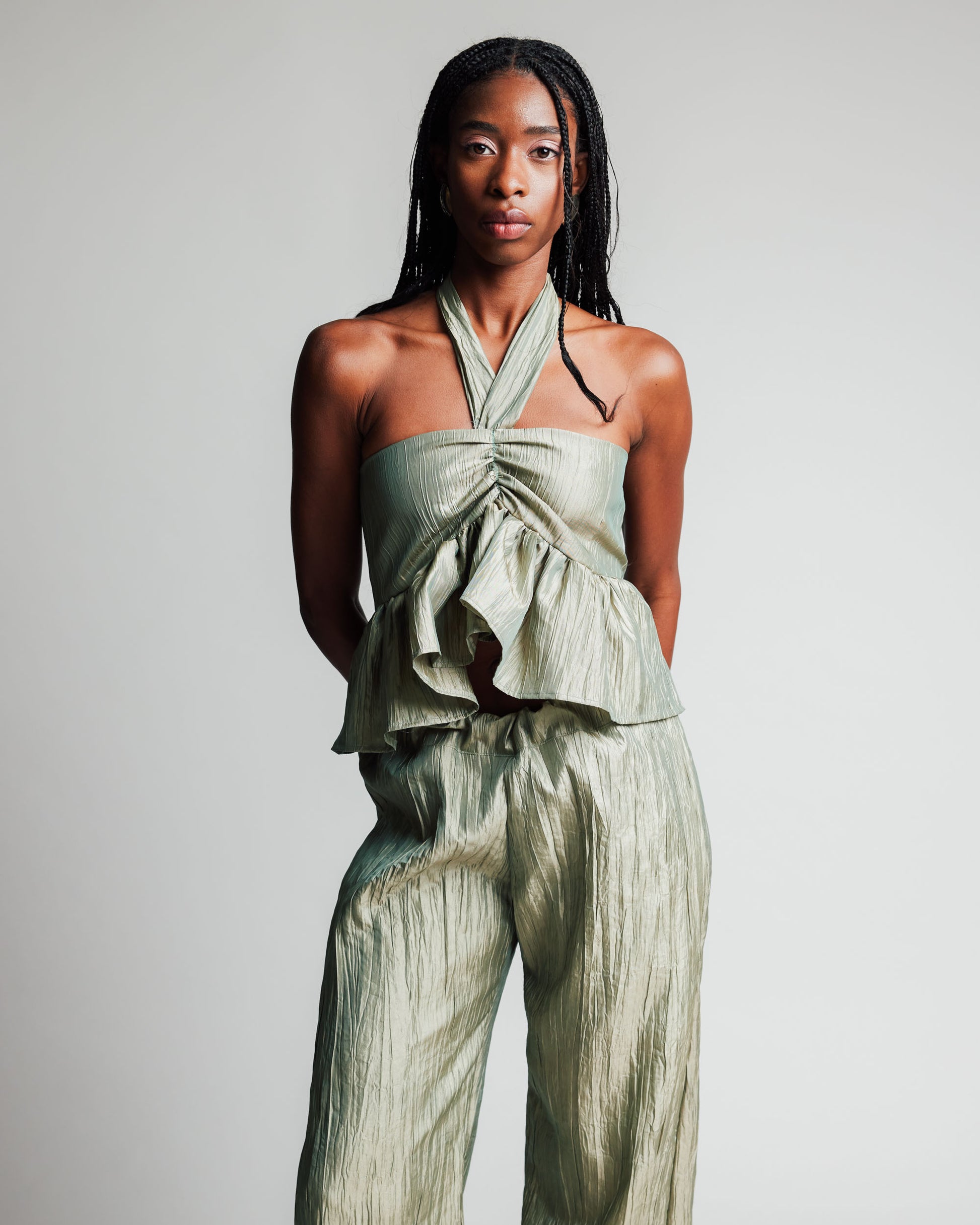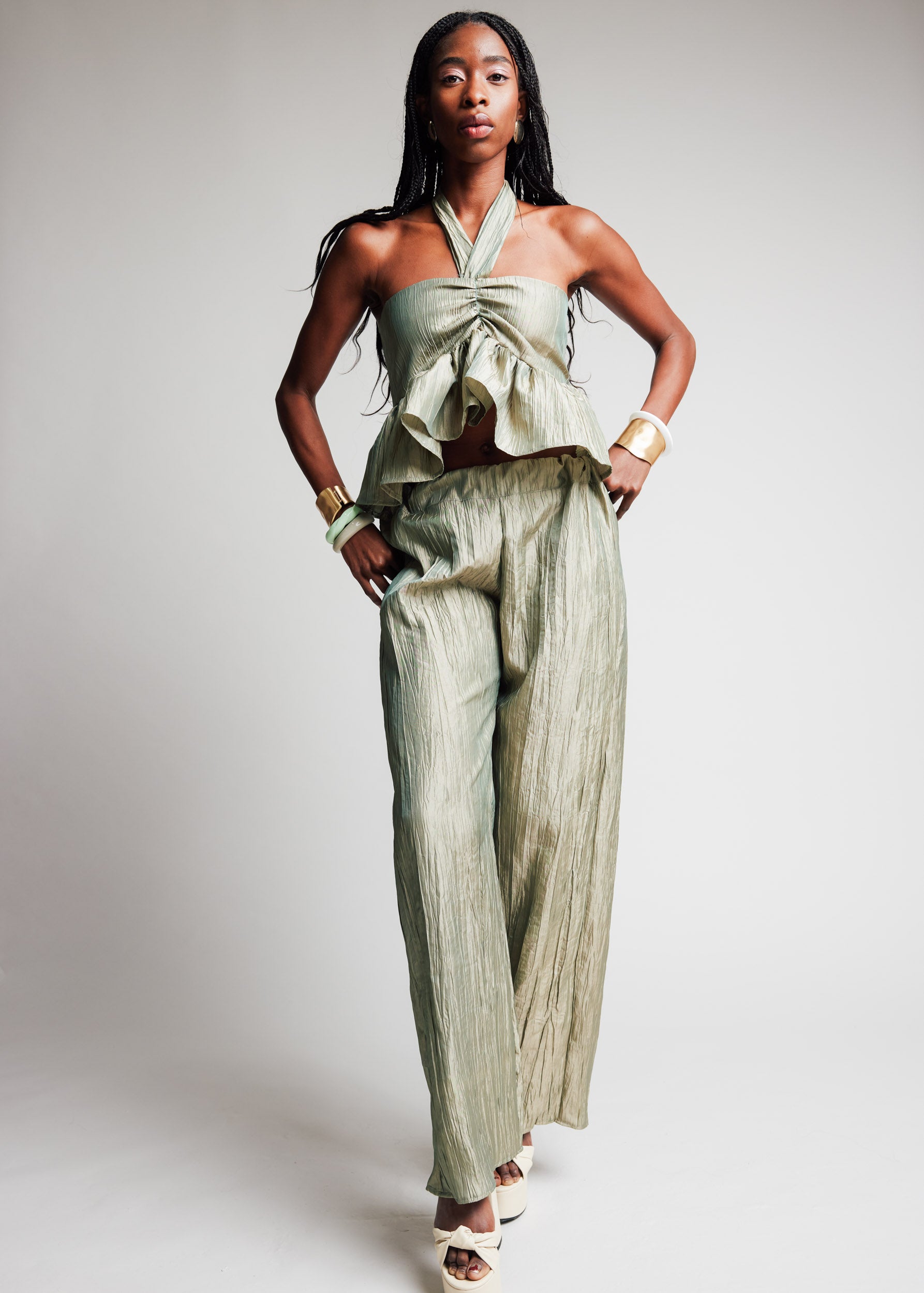 This Resort Set is made of pleated elastic pants paired with the clementine top. This top ties around the neck.