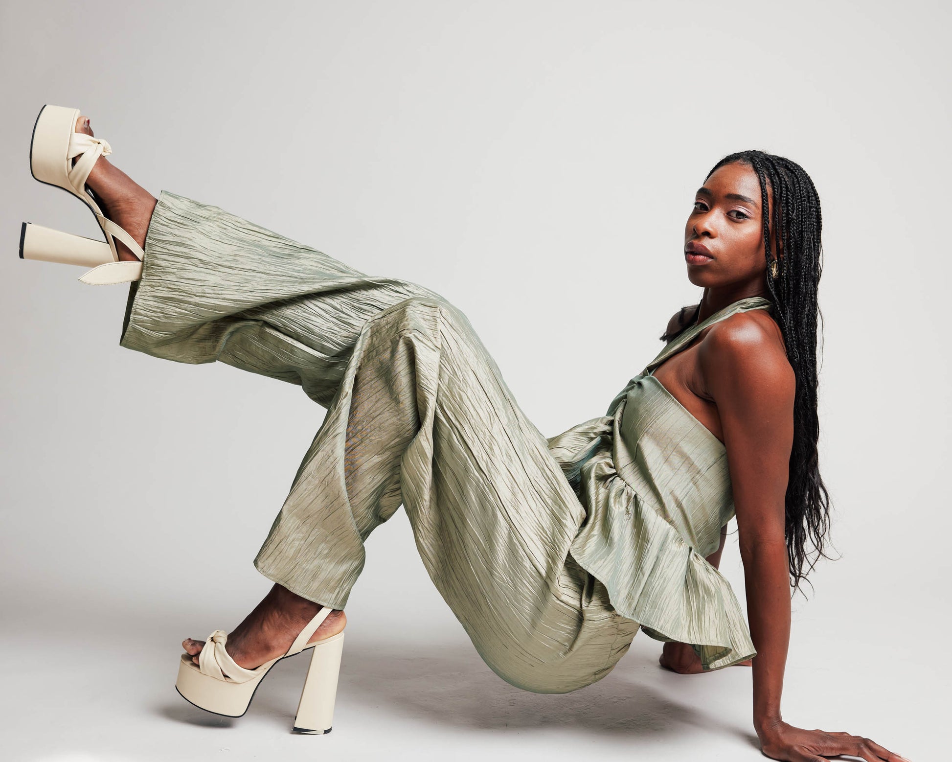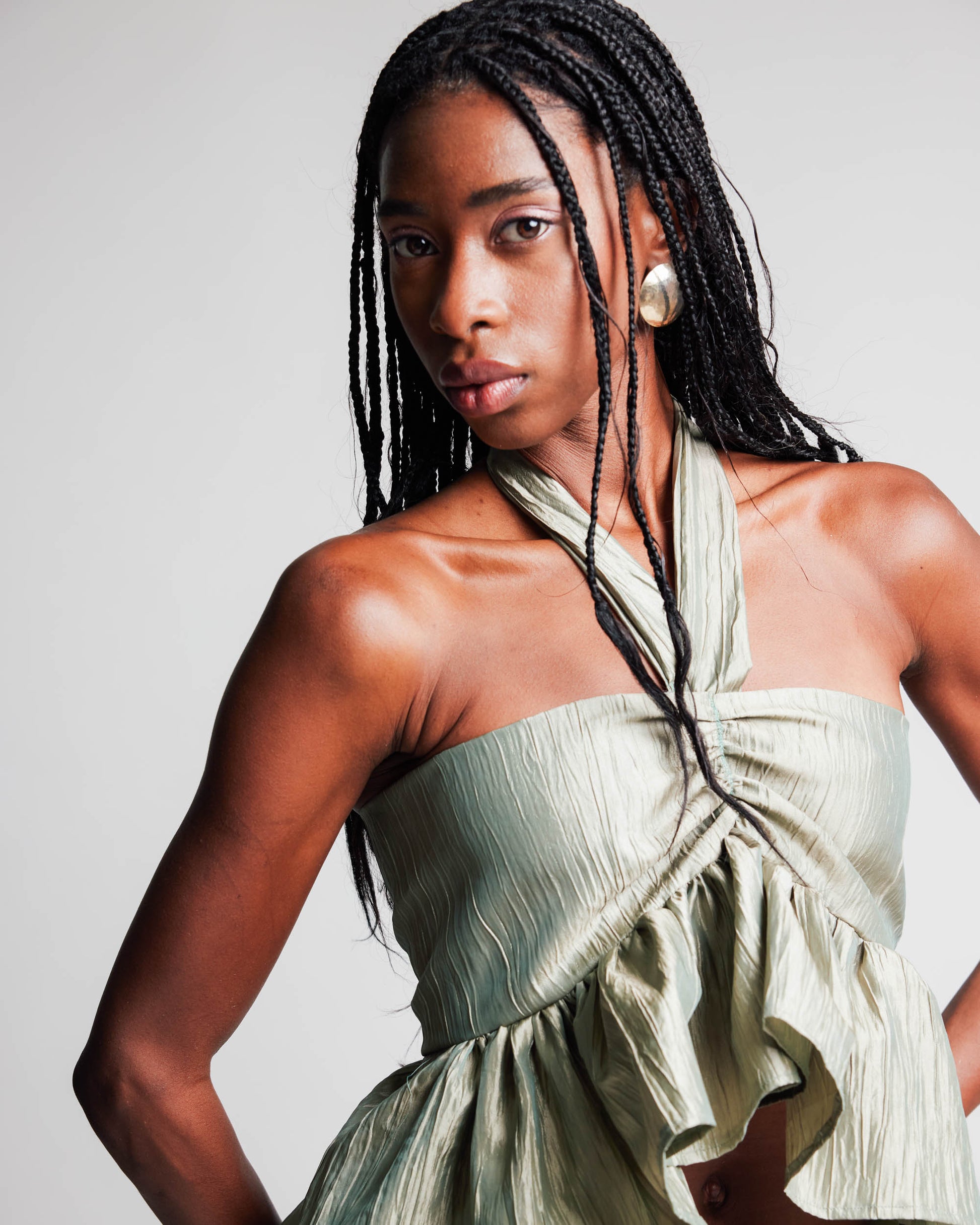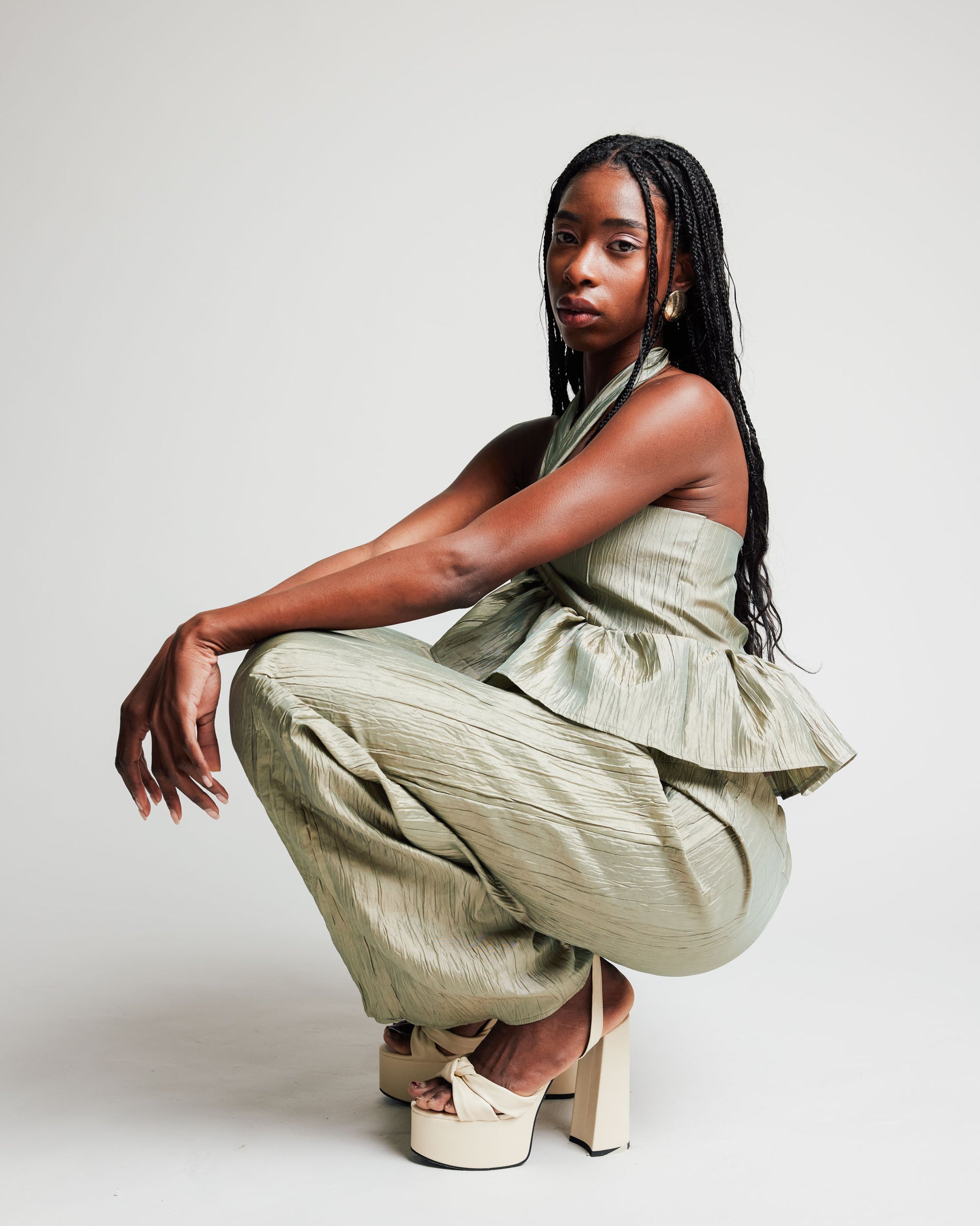 This Resort Set is made of pleated elastic pants paired with the clementine top. This top ties around the neck.